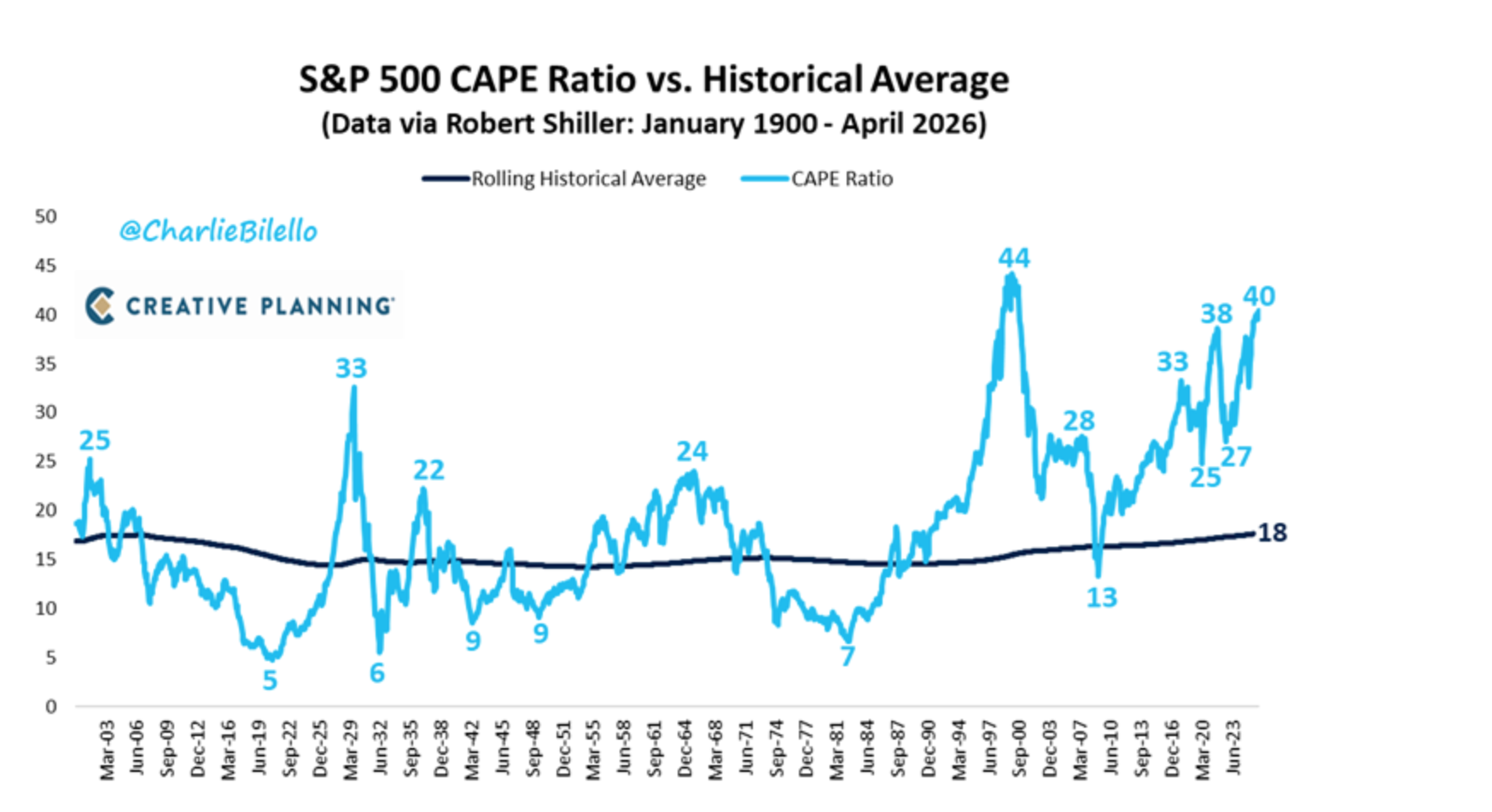 The S&P 500's CAPE Ratio has moved up to 40, its highest level since 2000 and now above 99% of historical valuations. $SPX pic.twitter.com/uhUt33SCp5