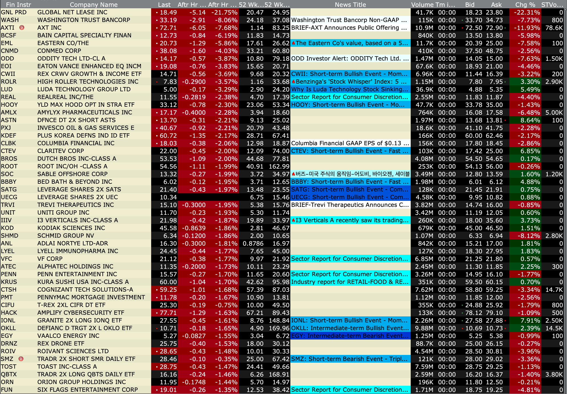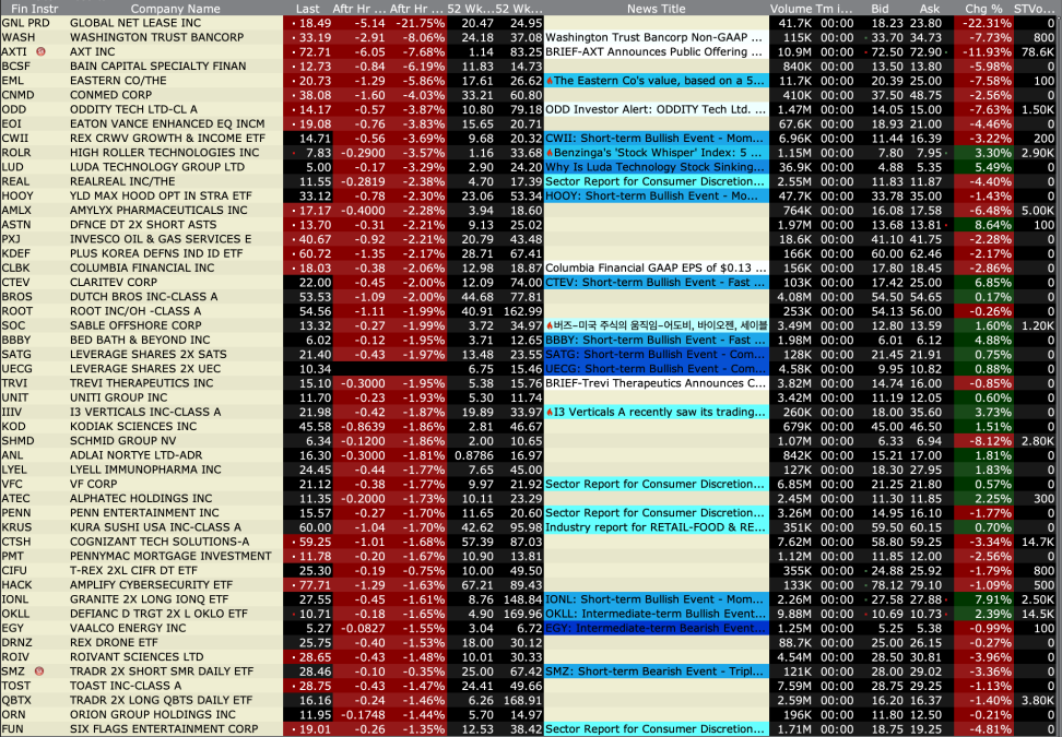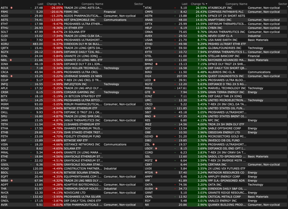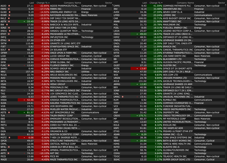 -CALM -3.2% (reportedly DOJ preparing an antitrust case against some large egg producers over alleged price coordination, including Cal-Maine and Versova)
