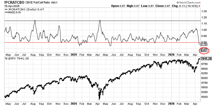The 5-day put/call ratio has collapsed while the market rallied and is into the "complacency zone." The one-day reading of 0.67 is also deep into that zone. I sometimes have tried to ignore this in the past because I don't want it to get any harder, and it feels too good with… pic.twitter.com/a4pTky0Pwq