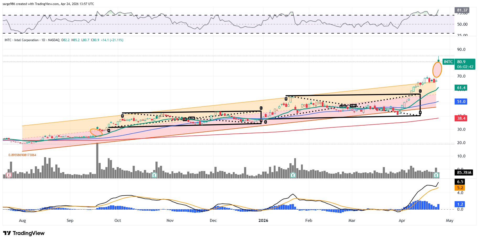 Readers will see that the shares of INTC had developed a basing period of consolidation that ran into late December 2025 before breaking out and developing a new "flat base" that ran into early April 2026. That uptrend is illustrated here by a Raff Regression model. Early in April, the shares retook both their 21-day EMA and 50-day SMA. This put swing traders and portfolio managers on the same team. The stock has clearly broken out from this trend.
