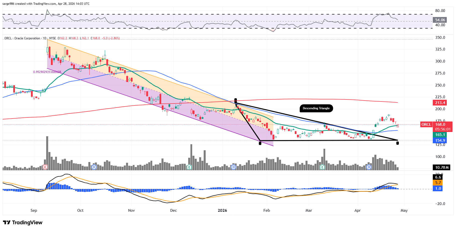 This chart, which is an updated version of one that I showed readers earlier this month, displays the downward sloping trend, illustrated by a Raff Regression model, that had taken ORCL shares dramatically lower since September.