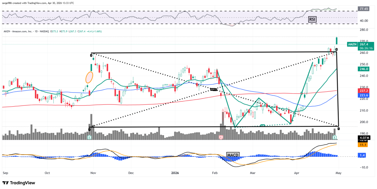 Readers will see that AMZN has recently broken out from a $259 pivot created by a rectangle pattern after having rebounded out of a double-bottom pattern. While relative strength is technically overbought, the daily MACD is set up in overtly bullish fashion.