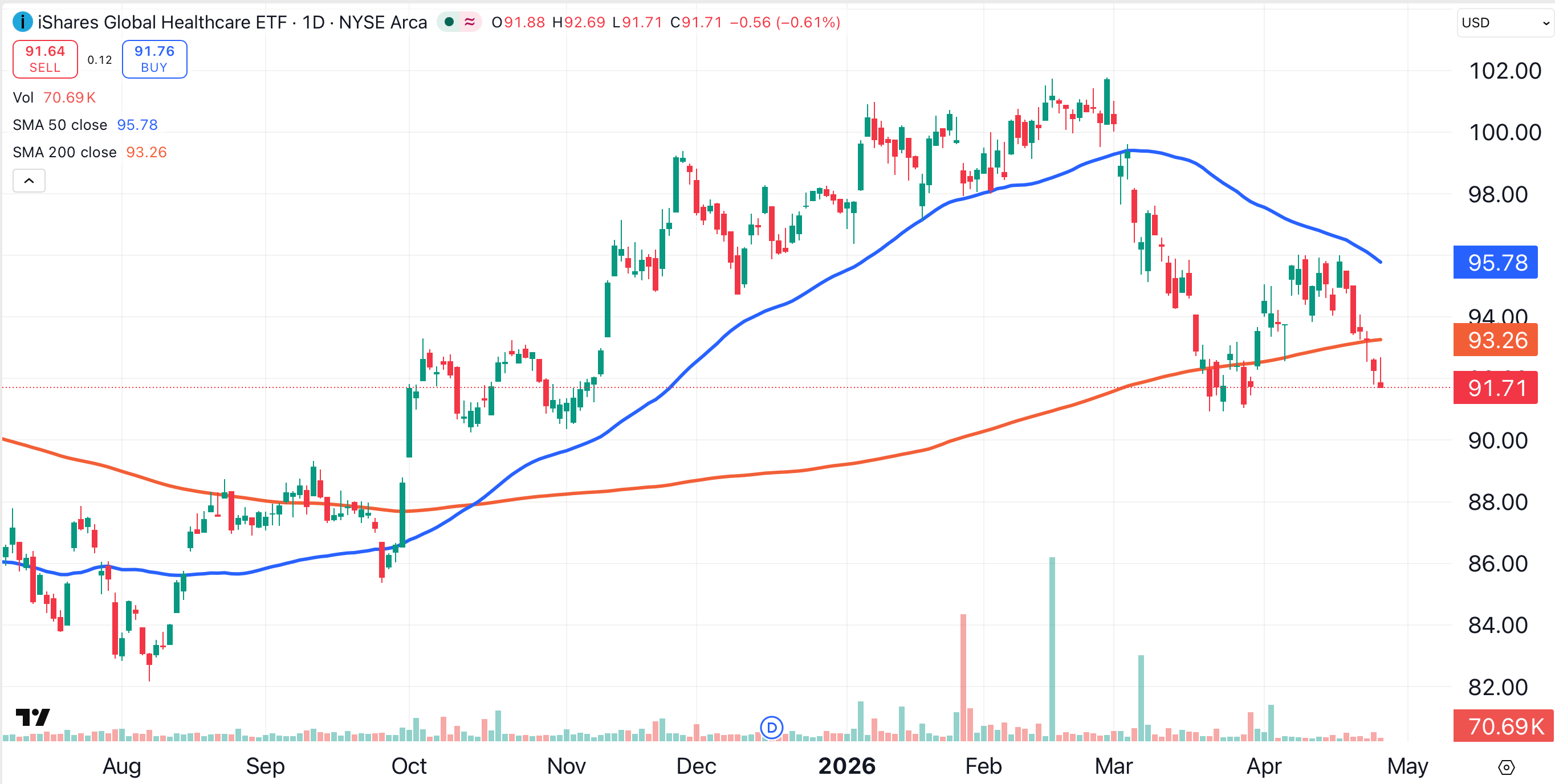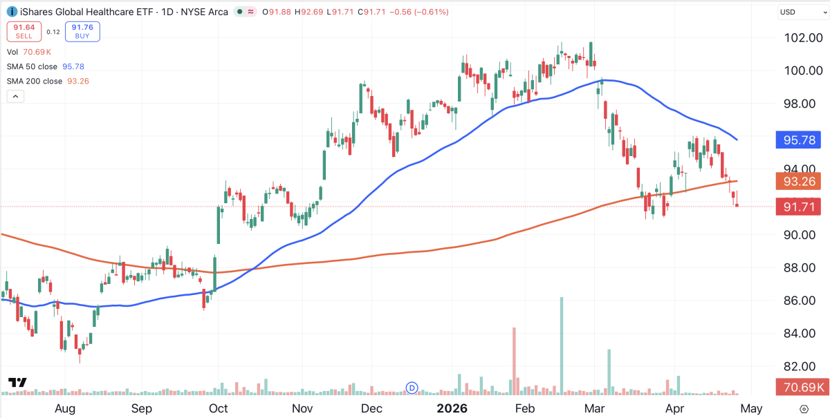 The healthcare sector, represented here by the iShares Global Healthcare ETF (IXJ), has a similarly bearish look. It simply hasn’t been a good time to own this sector.