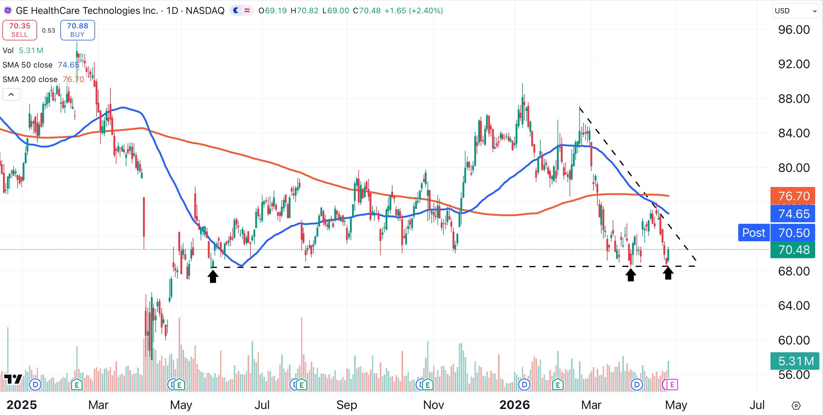GE Healthcare’s chart doesn’t look great. The good news is that there doesn’t appear to be anything company-specific at work here. This is just a case of being in the wrong sector at the wrong time.