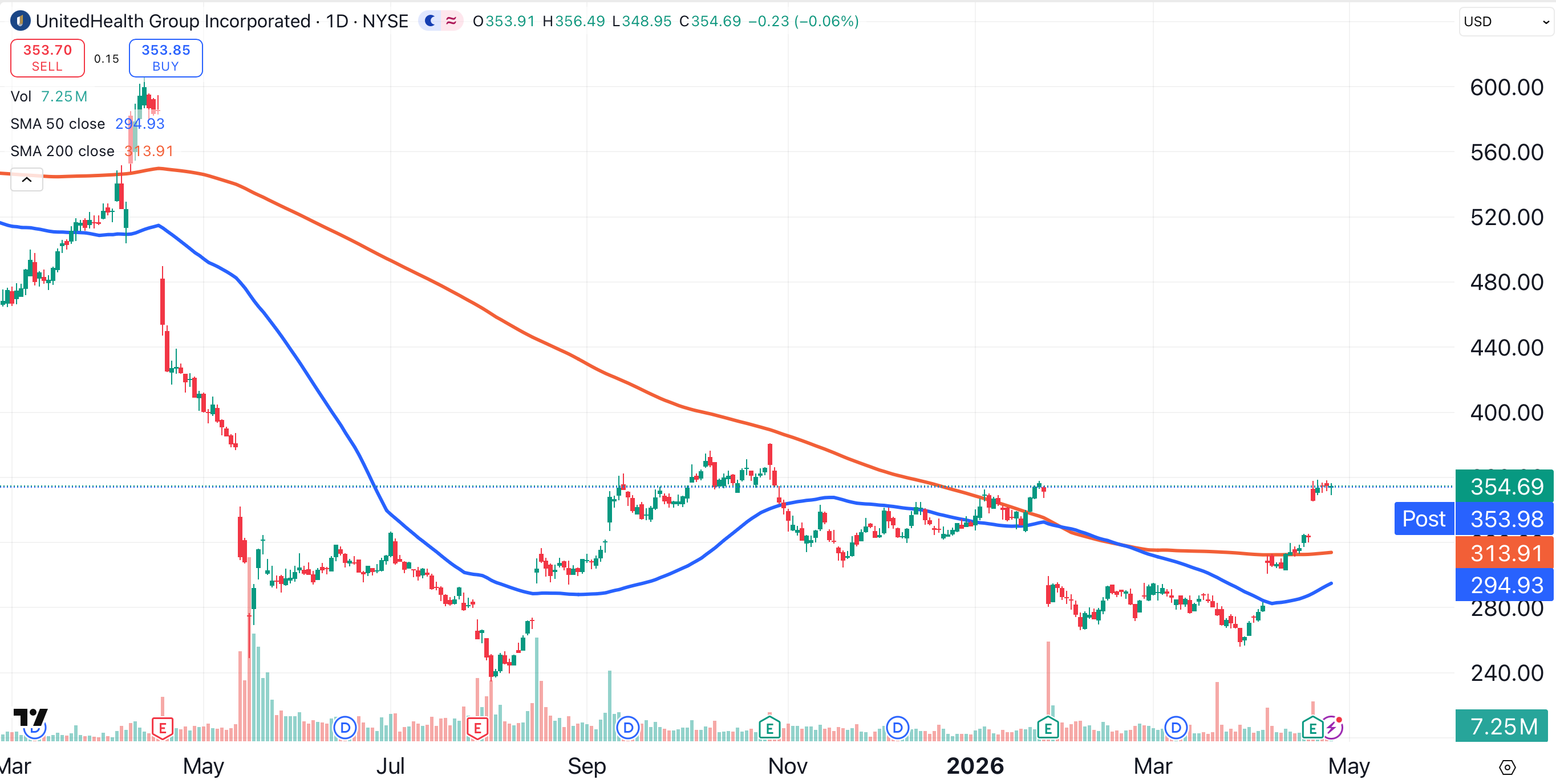 Hopefully those companies will follow the lead of United Healthcare (UNH) , which had a decent report last week. United Healthcare is now up by 5% this year, and is finally trading above its 50-day (blue) and 200-day (red) moving averages.