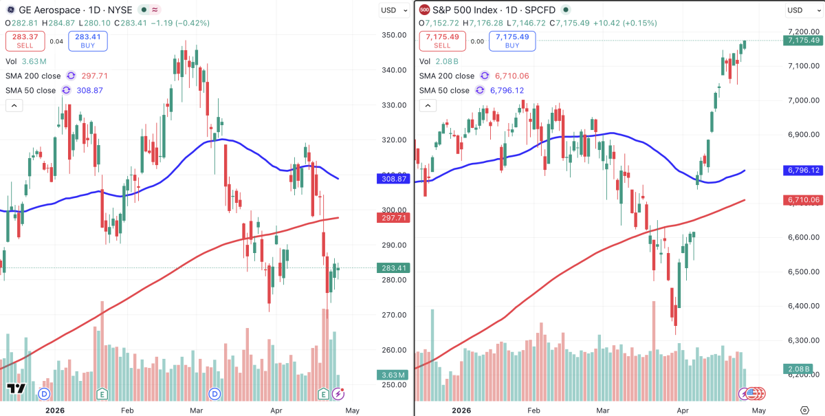 One of the reasons we reduced our position on GE Aerospace is due to the stock’s relative weakness. Recently, GE Aerospace (left chart) fell below its 200-day moving average, even as the broader market, represented by the S&P 500 (right chart), reached new highs.