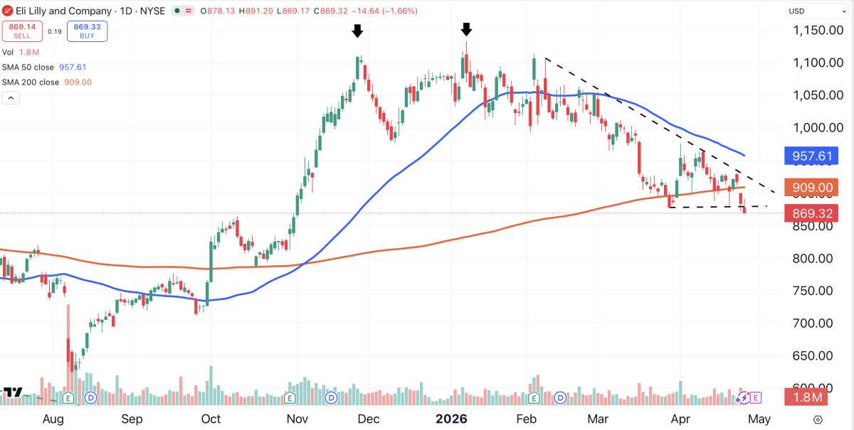 On Monday, as the S&P 500 reached yet another new high, Eli Lilly & Co. (LLY) reached its lowest level in nearly six months. Lilly is breaking down from a descending triangle pattern (dotted lines), and has fallen below its 200-day moving average (red).